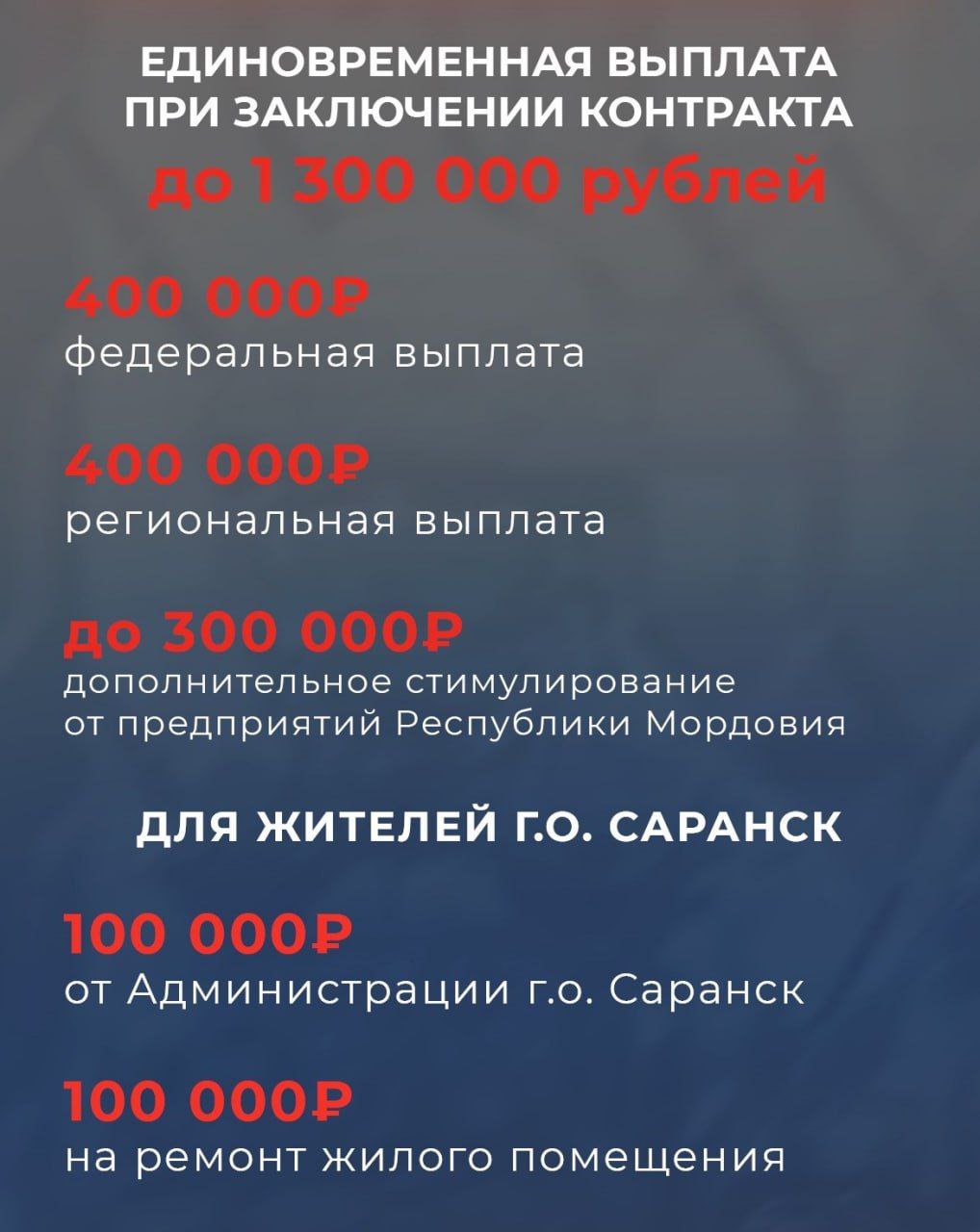 Таким образом, общая сумма единовременных выплат и стимулирований при заключении контракта в Республике Мордовия составит примерно 1 миллион 300 тысяч рублей.