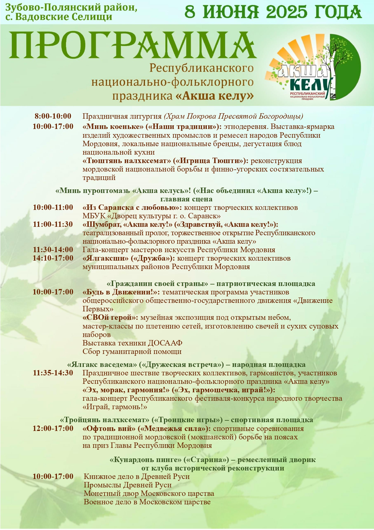 Республиканский национально-фольклорный праздник «Акша келу» состоится 8 июня в с. Вадовские Селищи Зубово-Полянского района Республики Мордовия.