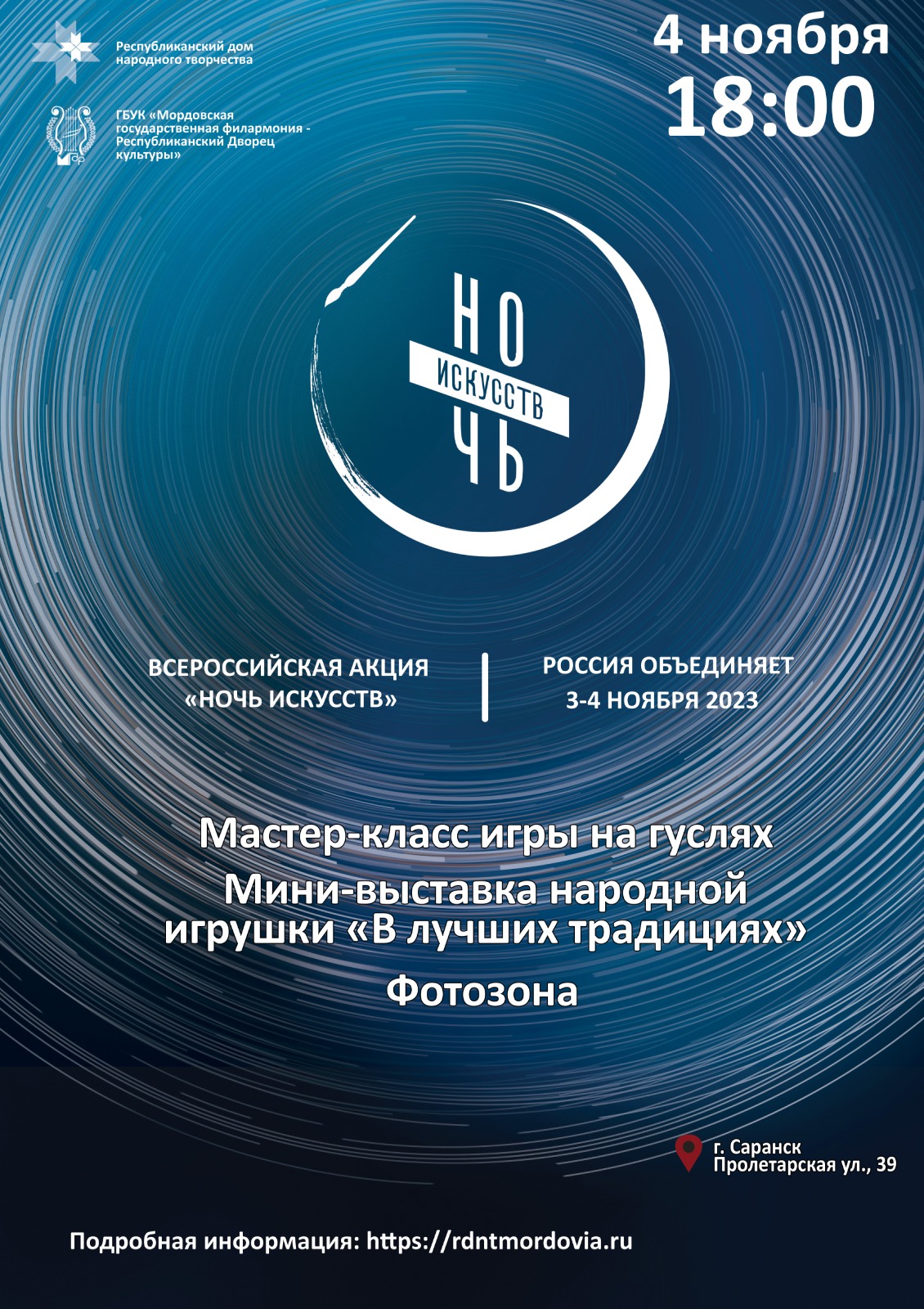 4 ноября в 18.00 ГБУК «РДНТ» в рамках Всероссийской культурно-образовательной акции «Ночь искусств» организует мини-выставку, мастер-класс и фотозону в холле первого этажа РДК (ГБУК "Мордовская государственная филармония — Республиканский Дворец культуры"; г. Саранск, ул. Пролетарская, 39).