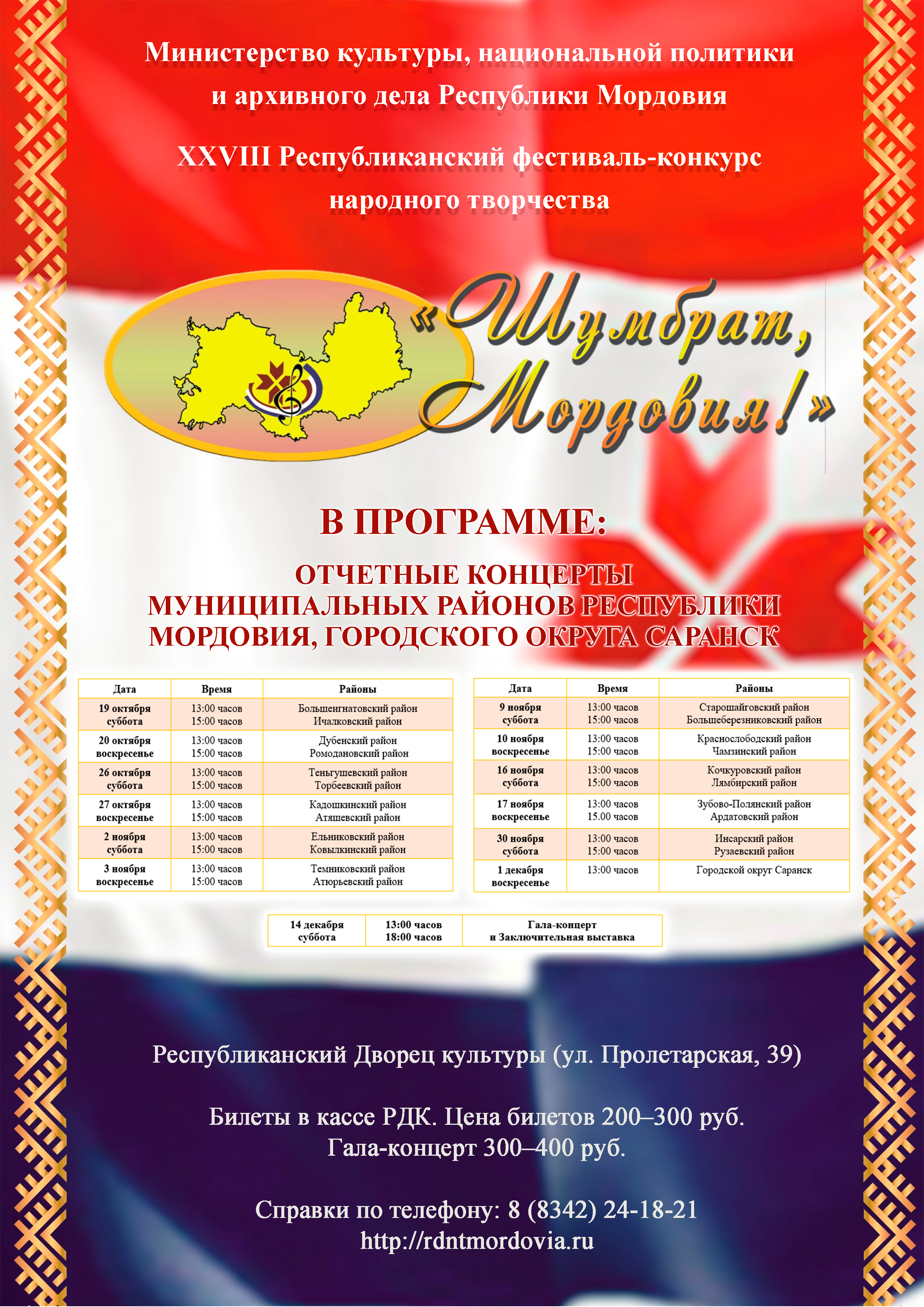 19 октября в г. Саранске стартует Республиканский фестиваль-конкурс народного творчества «Шумбрат, Мордовия». Тема фестиваля этого года «Шумбрат, Мордовия многонациональная!». Она раскроет и подчеркнет важность сохранения, возрождения и приумножения традиционных российских духовно-нравственных и культурно-исторических ценностей, а также сохранения этнокультурного многообразия, единения и самобытности народов, населяющих республику.