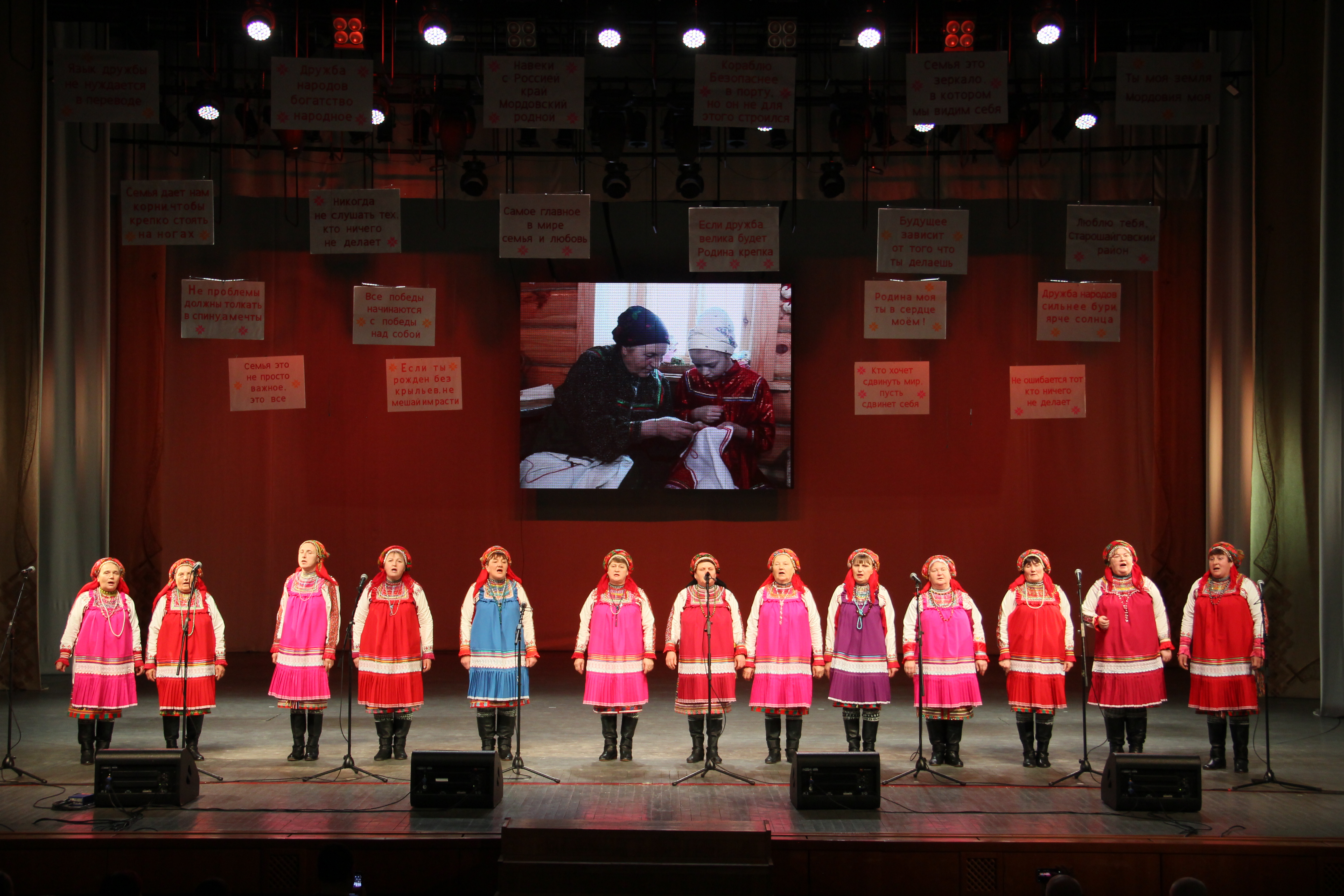 Главные в мире ценности – семья и любовь. Именно под этим лейтмотивом прошли выступления артистов и творческих коллективов художественной самодеятельности Старошайговского муниципального района. Мордовские народные песни чередовались с русскими, создавая неповторимую мелодию народного единства. Композиции о любви к родине, о чувствах прозвучали от таких фольклорных ансамблей, как «Мокшаваня», «Синельга», аплодисментами встречали зрители Старотеризморгский народный хор, народный ансамбль «Рябинушка», хор ветеранов. Веселые частушки в исполнении семейного ансамбля «Пайгонят» и трогательная вокально-хореографическая композиция «Мама» подчеркнули посвящение фестиваля Году семьи. Гости также могли посетить выставку декоративно-прикладного искусства «Мастерство земли мордовской», где свои работы представили местные умельцы: изделия из дерева, джута, шерсти, бисера, фигурки из глины, расписные игрушки.