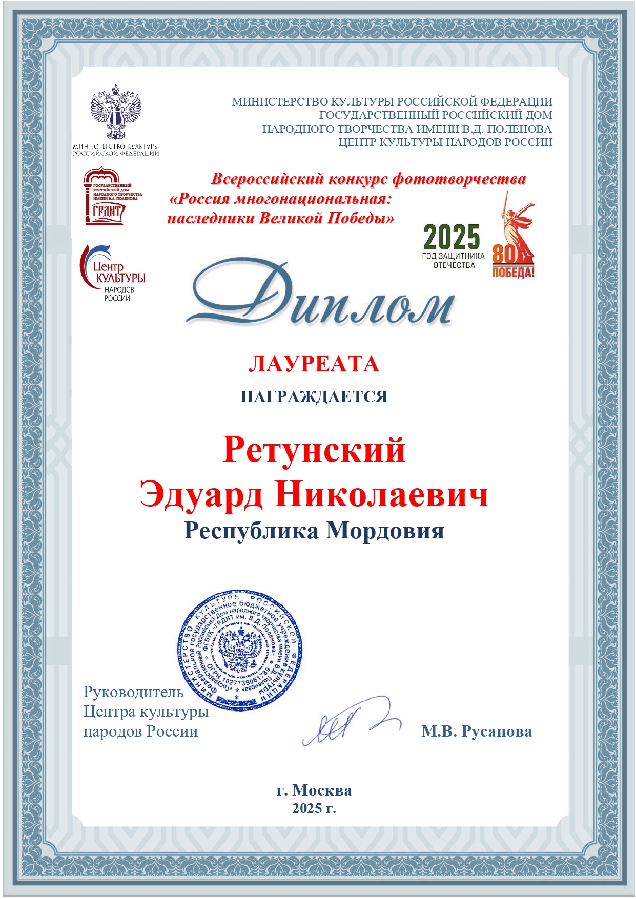 Поздравляем Эдуарда Николаевича Ретунского с заслуженным дипломом лауреата Всероссийского конкурса фототворчества «Россия многонациональная: наследники Великой Победы»!