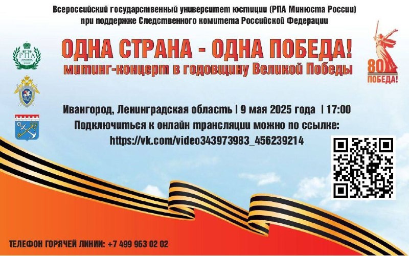 Приглашаем вас присоединиться к онлайн-трансляции торжественного митинг- концерта «Одна страна – одна Победа», организованного Всероссийским государственным университетом юстиции (РПА Минюста России) при поддержке Следственного комитета Российской Федерации в честь годовщины Великой Победы.