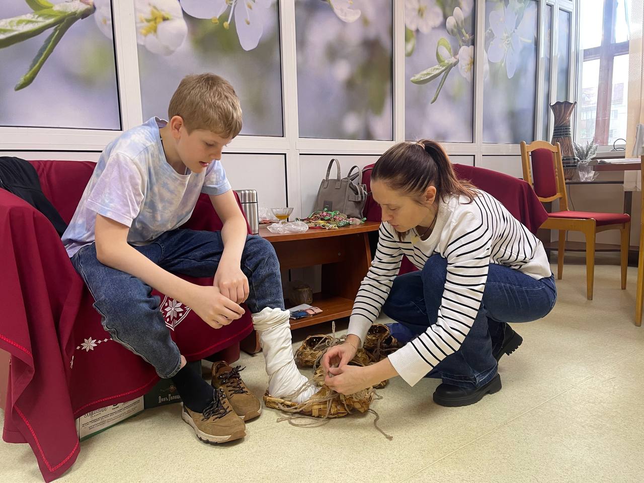 Ткани и отделка трудами мастеров ЗАО «Мордовские узоры» сложились в яркий образ, который подчёркивается настоящей народной обувью. Лапти примерили, искусство наматывания онучей освоили.