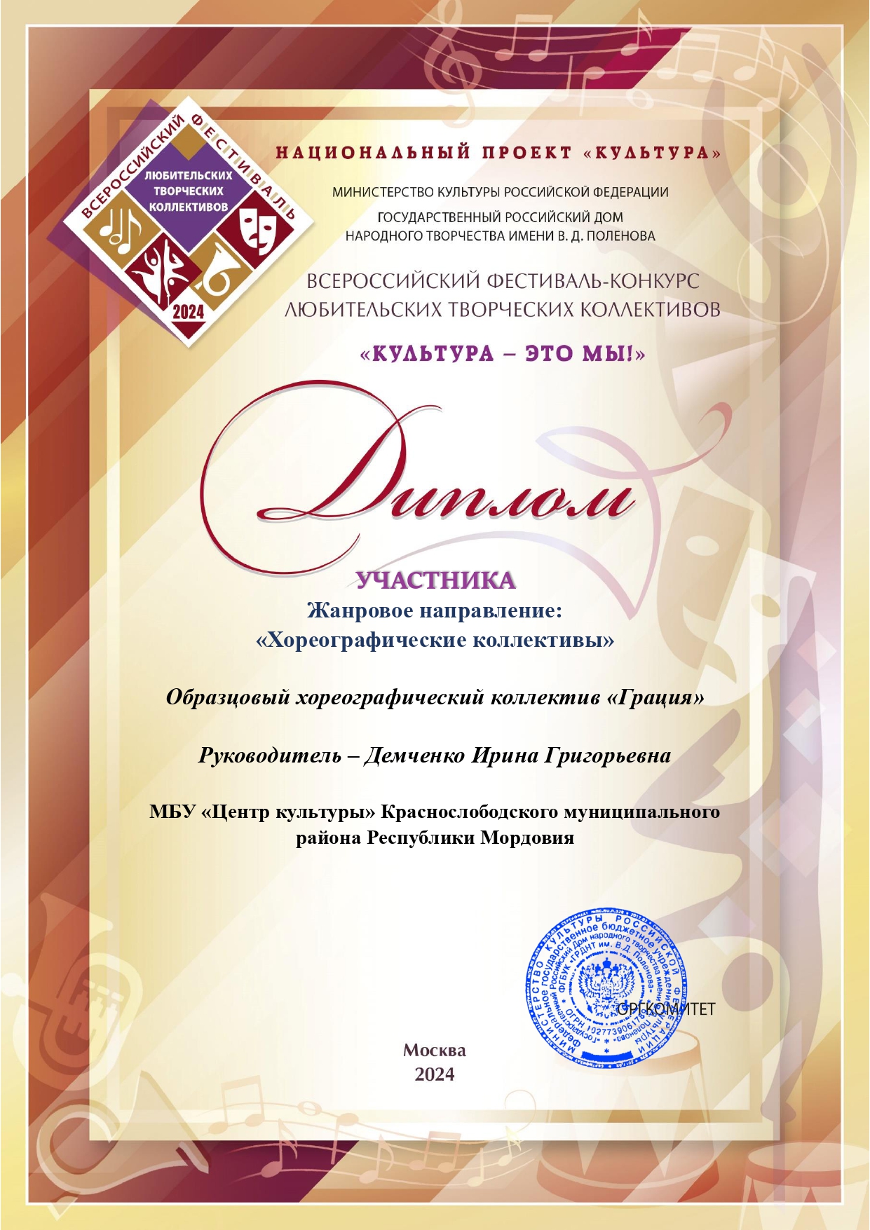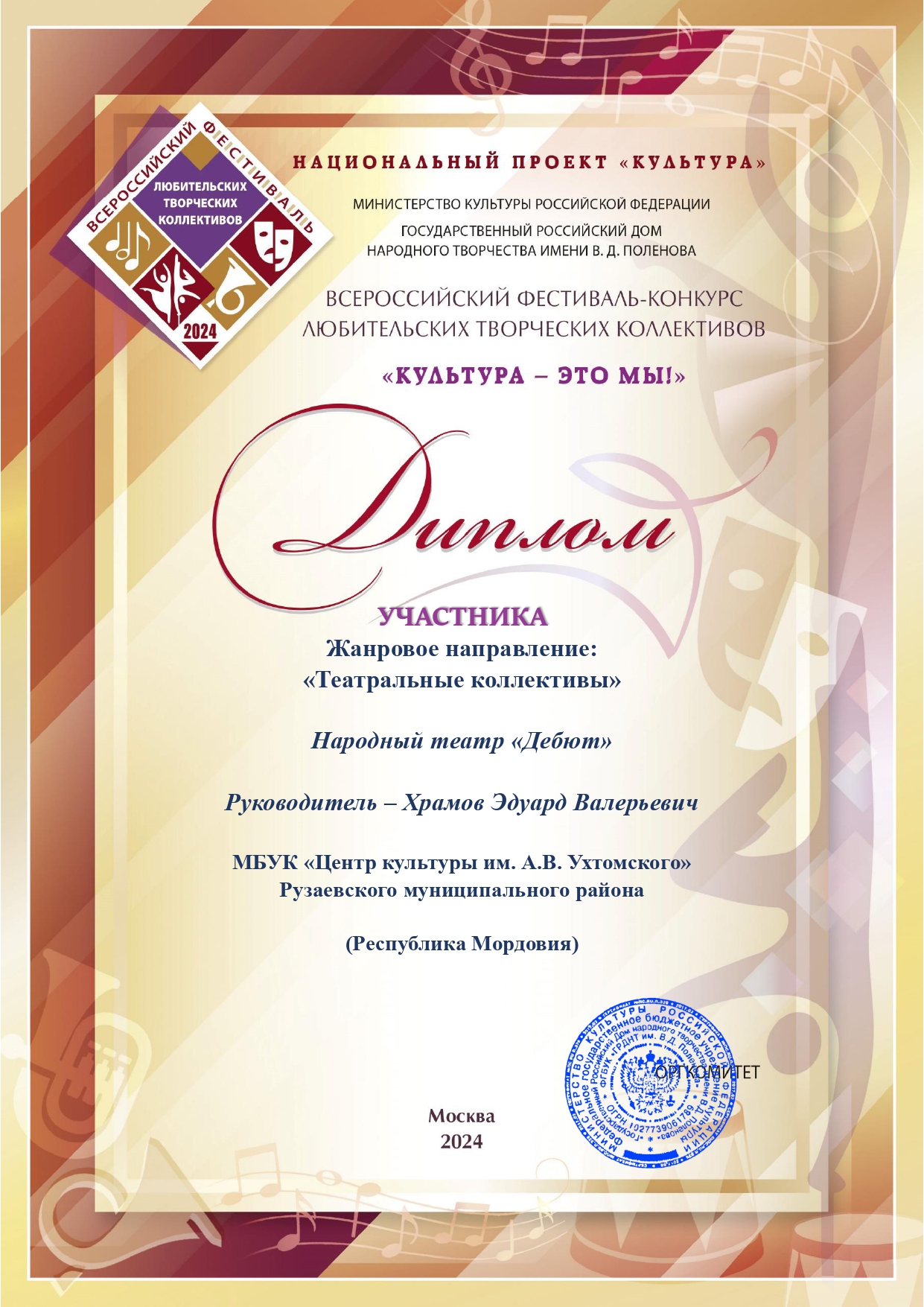 Дипломами за участие были отмечены: Образцовый хореографический коллектив «Грация» (МБУ «Центр культуры» Краснослободского муниципального района, рук. Ирина Григорьевна Демченко) и Народный театр «Дебют» (МБУК «Центр культуры им. А. В. Ухтомского» Рузаевского муниципального района, рук. заслуженный работник культуры Республики Мордовия, трижды лауреат Премии Главы Республики Мордовия в области театрального искусства Эдуард Валерьевич Храмов).